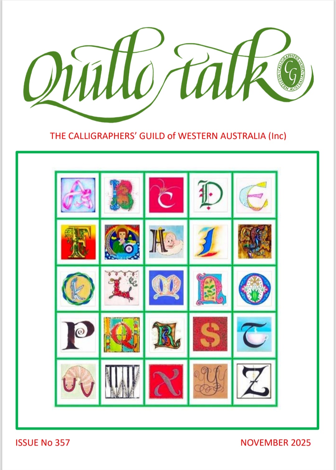 ‘Quillo Talk’ is the monthly newsletter of the Calligraphers’ Guild of WA and distributed to our members electronically as a PDF by email. Country and city members who are unable to attend meetings rely on the newsletter for up to date information on the happenings within the Guild. The newsletter also provides information on upcoming workshops, exhibitions and other calligraphy based articles and events.