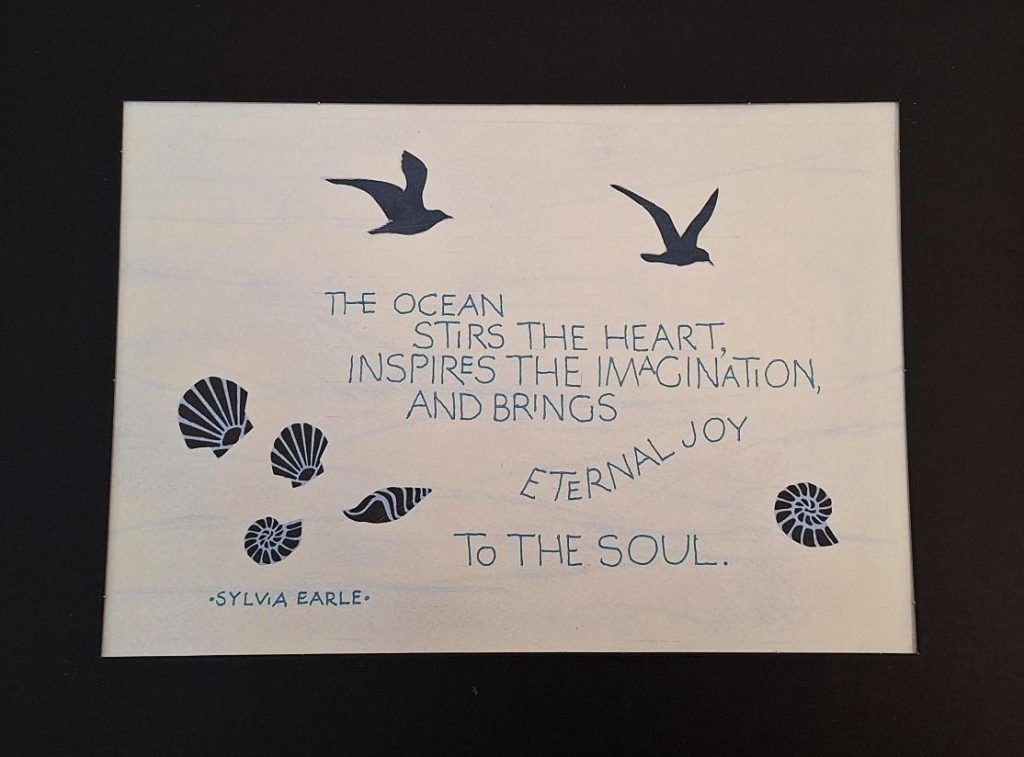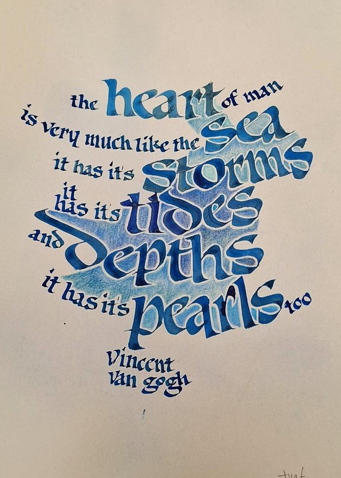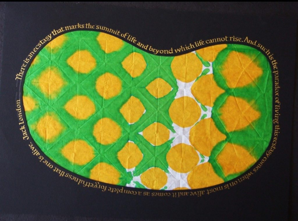 Martin Dickie – Continuing with his study of Insular Capitals, Martin was inspired by a piece from Celia Lister to write them not as Versals but with a non-edged nib, a Speedball B3. This resulted in this work, written *boustrophedon manner (as the ox ploughs) to emphasise that the lettering is decorative. The text is part of an article in Letter Arts Review by Rosamund Casey: ‘Creativity and the Roman Alphabet.’ *Written from right to left and from left to right in alternate lines.Leith Cohoe – Leith produced this piece by alternately dipping the same nib into blue and green Ecoline inks.Jenny Fowles – Jenny used watercolour for the background foliage and Ecoline ink for the text.Jenny used Ecoline inks to produce the look of watercolour for the background for her Uncial practice piece. This piece also featured on the May issue of Quiilo Talk coverLeith Cohoe – Moonshadow Mist sprayed as the background with the text written in black ink.Created by Gaye Godfrey-NichollsThea used the Quote of the Month to produce this pieceMartin made this piece using the technique OrizoJanelle Macgregor